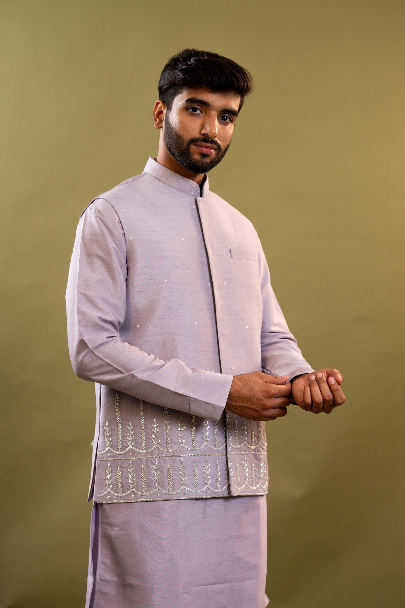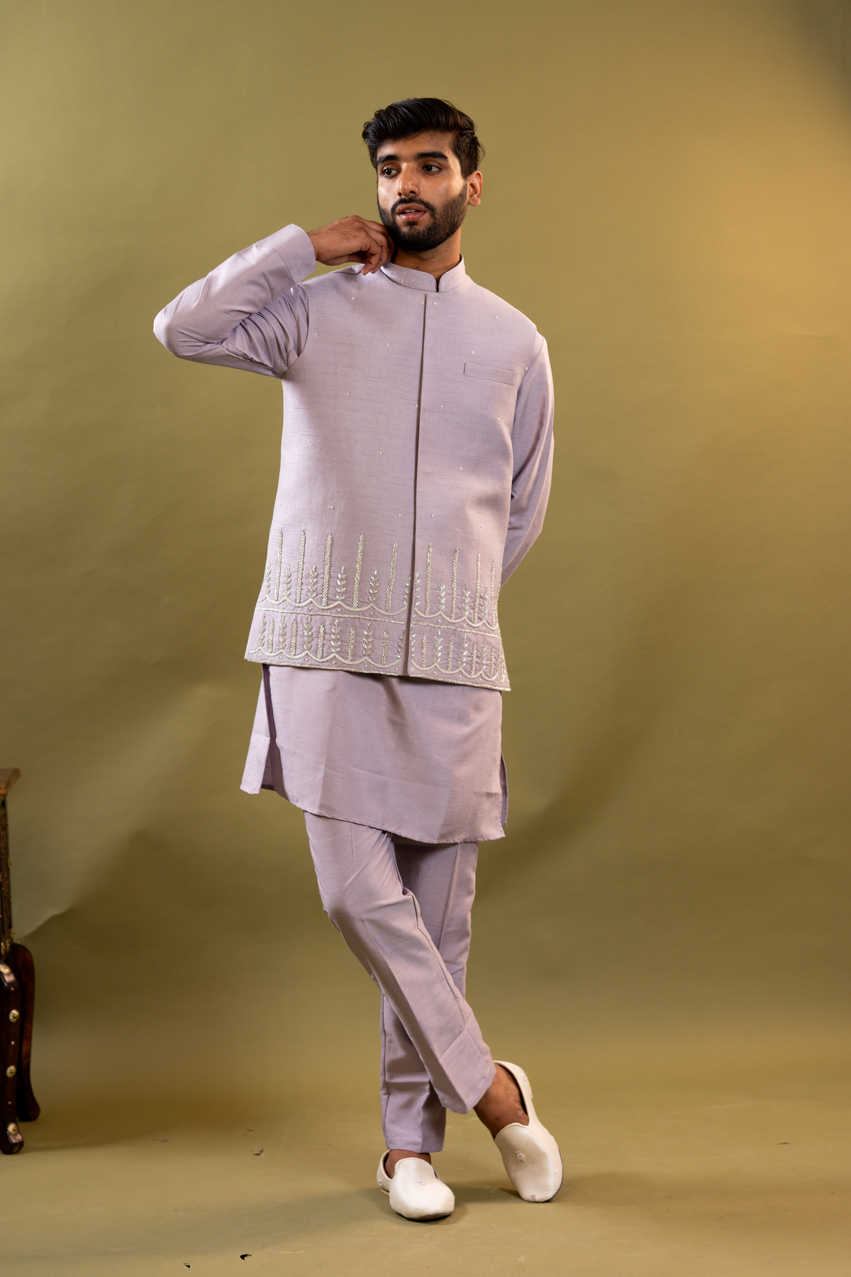 Handwork Nehru Jacket with kurta pyjama set For Men | Modi Jacket 3 piece set | Indian wedding wear outfits | waistcoat | kurta pant with jacket - lavender / 38