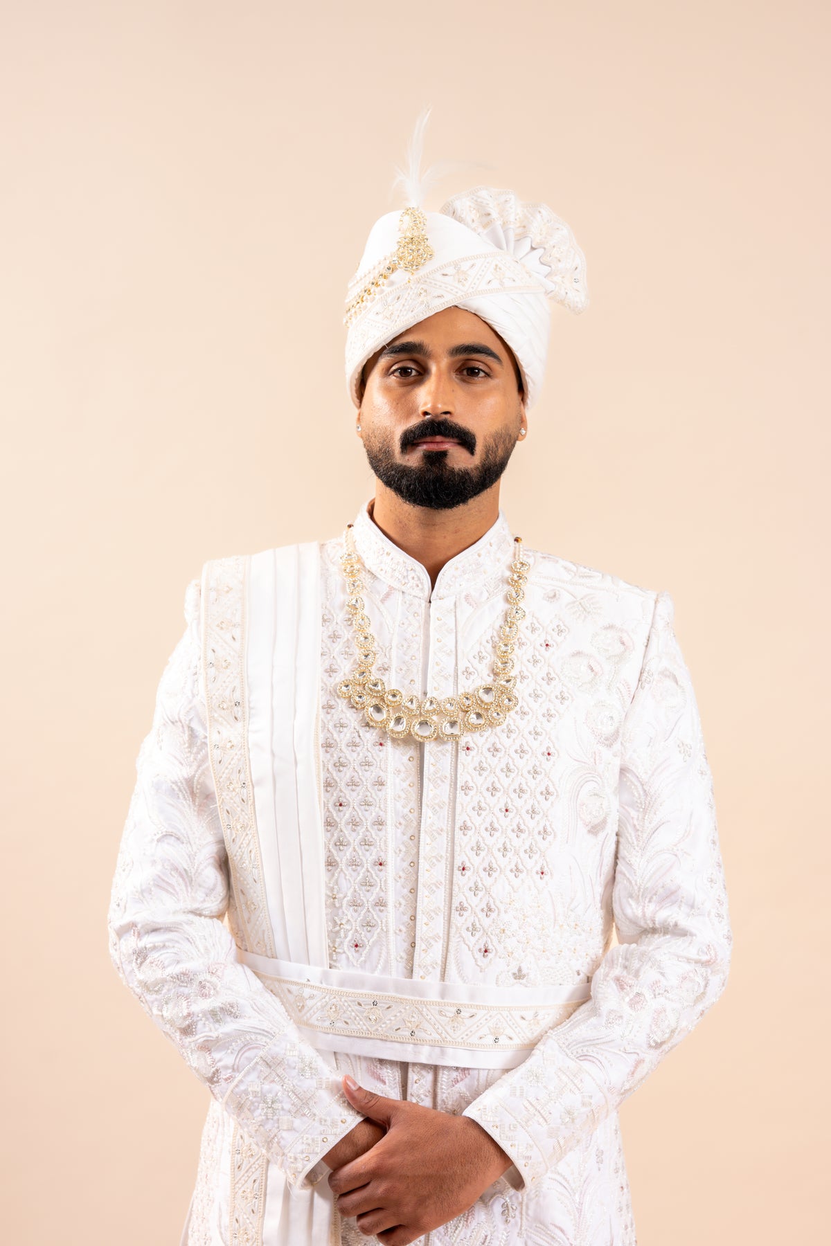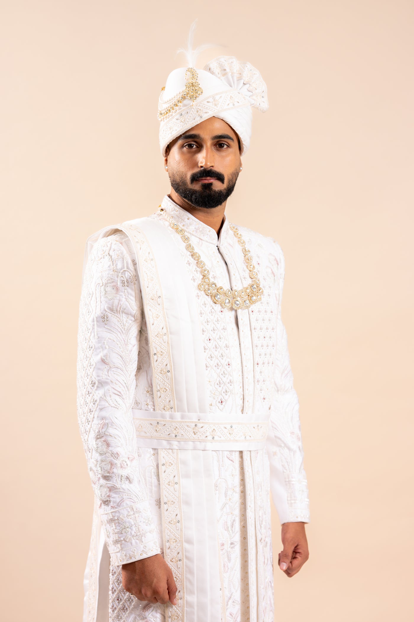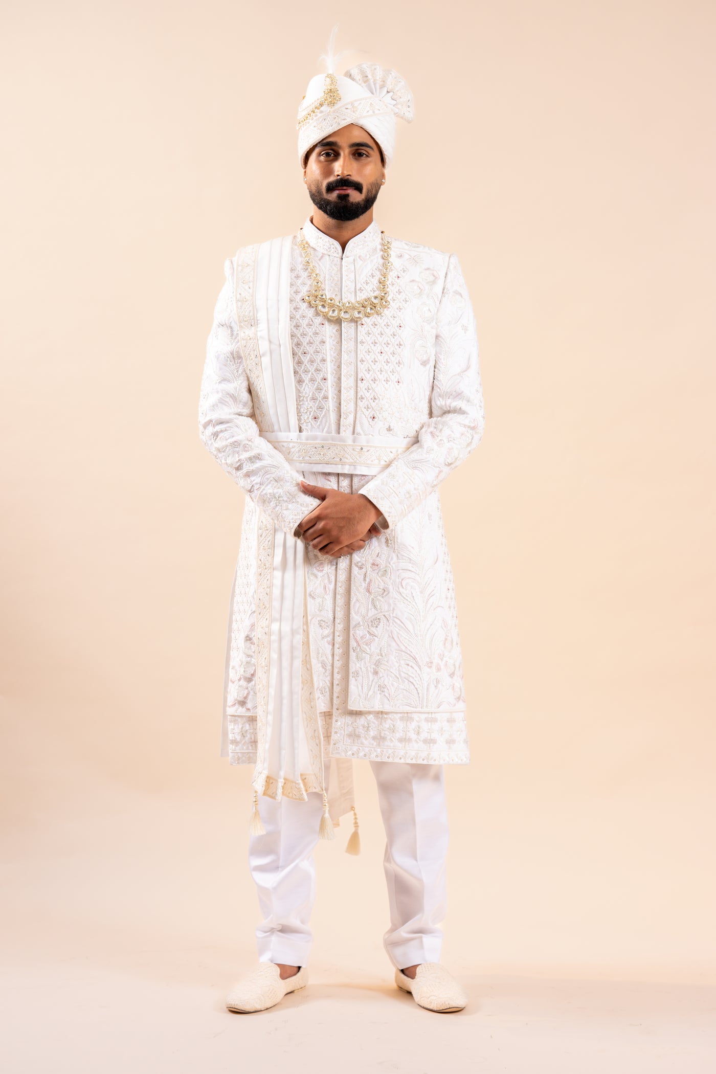 Richart as a brand brings you quality and affordability. In market since 2015 we take pride in our commitment to maintain quality standards in each piece manufactured by us. This special outfit from richart stands out because of its stylish self design sherwani . The sherwani is made up of silk fabric. This set comprises of a coloured sherwani & pants with stole turban and necklace and turban broach . Team this outifit with embroidered mojris and look apart on special occasions. Product size guidance (a): please refer to chest size .This iridescent ivory coloured sherwani set combines a traditional silhouette with contemporary elements to furnish a unique wedding outfit that is stylish yet customary. Wash care: wash dry clean recommended. This sherwani has been made by our karigars (craftsmen) with a lot of love and eye for detail.